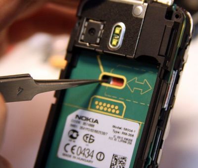 Посмотрите на фотографию, где наш эксперт с прикладыванием некоторых усилий и при помощи сноровки все-таки извлекает из Nokia 5800 sim-карту. Зачем прятать симку за толщей корпуса и микросхем – большая загадка! Однако на плате есть даже инструкция в виде двусторонней стрелки, подсказывающей, что карту надо извлекать через небольшое отверстие.
