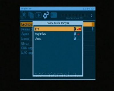 Для того, чтобы настроить подключение к беспроводной сети, следует вставить поставляемый в комплекте WI FI адаптер в один из USB портов. Далее войти в МЕНЮ и выбрать пункт Настройка WI FI.