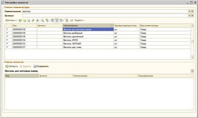 В верхней части формы необходимо выбрать основную позицию номенклатуры, для которой мы хотим ввести аналоги, в нижней добавить необходимые позиции номенлатуры, являющиеся аналогом для основной.