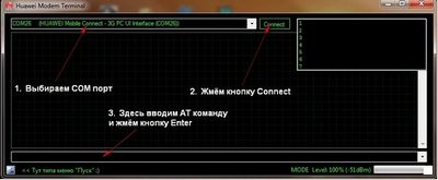 AT команда служит для управления некоторыми функциями модема. Команды можно вводить специальными программами, это намного проще чем встроенным в Windows XP hyperterminal. Для этого можно использовать программы: My Huawei Terminal или DC-Unlocker. Перед использованием данных программ нужно закрыть все другие программы которые могут использовать модем. Для модемов Huawei нужно подключаться на COM порт 3G PC UI Interface , для модемов ZTE MF на COM порт ZTE Proprietary USB Modem . Как пользоваться смотрим картинки, всё достаточно просто. Если команд несколько, сначала вводим одну - жмём Enter. потом следующую и опять жмём Enter.