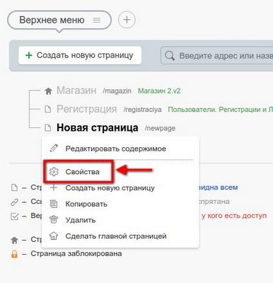 Для того чтобы перейти к редактированию заголовка и мета-тегов страницы, нажмите на страницу. которую необходимо оптимизировать и выберите из раскрывшегося меню пункт Свойства .