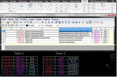 Потоки кабелей удобно редактировать, так как можно скопировать кабельный журнал, удалить не нужные столбцы, вспомогательные скрыть. Ниже приведена таблица в СПДС GraphiCS (поток 2) и то как она выглядит в AutoCad.