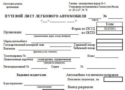 Путевой лист легкового автомобиля по форме 3 в бухучете