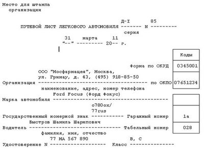 Как оформить путевой лист легкового автомобиля на месяц (образец )?