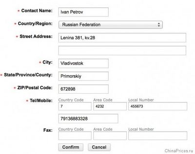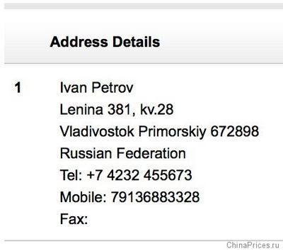 Правильно заполненный адрес и контактная информация на Алиэкспресс выглядит следующим образом.