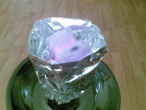 Теперь можно обтянуть чашу фольгой. Не рекомендую пользоваться металлическими пластинами с дырками, которыми можно заменить фольгу, с ними табак будет подгорать, а из за того что дырки слишком большие пепел будет ссыпаться внутрь чаши. Итак, берем фольгу (лучше самую обычную пищевую, шириной 30 см, обычно продается в рулонах по 10 метров), отрываем квадратный кусок и сворачиваем в четверо, глянцевой стороной внутрь. Далее обтягиваем чашу, максимально плотно и разглаживаем для большей герметичности. Делаем дырки. Лучший вариант – тонкой иглой, не лучший – зубочисткой или серьгой подруги. Центральное отверстие можно сделать пошире, остальные на равных расстояниях, почаще и по всей ширине чаши.