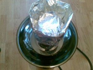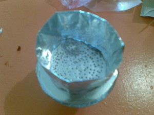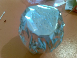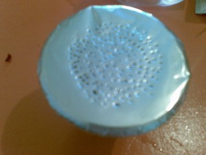 7. Обтягиваем чашу с кольцом еще одним четверным слоем фольги и делаем дырки, но уже пореже, чем в первом слое.