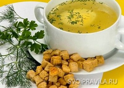 - Обед: Куриный бульон (без приправ!) с зеленью и кусочком (100 г) отварной курицы без шкуры. Рыбные котлеты (2 шт.) с салатом (150 г) из капусты и зелени с растительным маслом, кусочек черного хлеба. Чай.