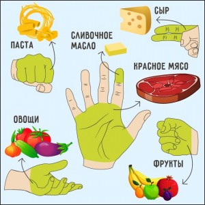 2) Принцип ладони. Чтобы не переедать, обзаведитесь красивыми небольшими тарелками. Размер съеденного за раз куска мяса/ рыбы/ птицы (белка) должен быть примерно равен центру ладони. Порция гарнира #8212; макаронных изделий из твердых сортов пшеницы/ крупы («сложных» углеводов) равна площади ударной стороны кулака. Количество овощей на один прием – сколько может поместиться во всей кисти руки и т.д.